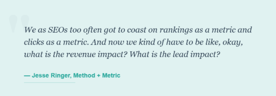 That reliance on rankings and traffic as standalone proof points is getting harder to justify. Rankings still matter less than they used to, and while traffic remains meaningful, neither metric is enough on its own. A page can rank well and still do very little for the business.